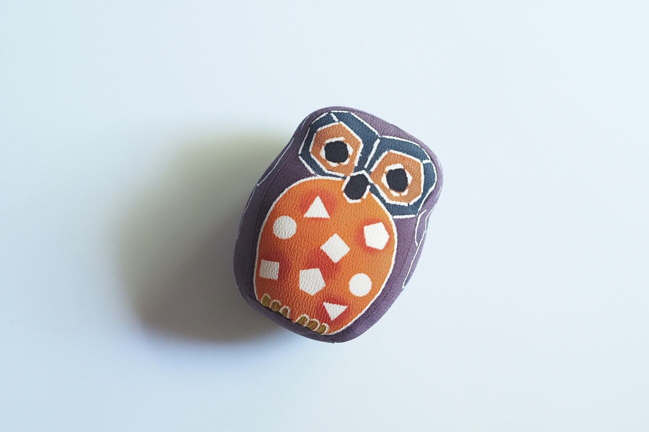 「型染め」という染色手法で一点ずつ手染めしたフクロウのぬいぐるみです。素材は絹縮緬(きぬちりめん)を使っており、一体一体手染めをしています。ぬいぐるみの中身は綿で、中央の底部に重りが入っているので、安定して自立します。一点ずつ縫製しているので、形に多少の誤差があります。中央の柄を合わせて並べたり、柄違い、色違いを並べても可愛いです。フクロウは多くの人の運気を良い方向に導く縁起物として、日本だけでなく世界で大切にされているものです。