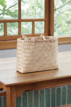 白木が美しいイタヤかごは、横型と縦型の2種届いています。こちらはその横型になります。はじめはこのように白いですが、使っていくうちに徐々に濃くなっていきます。持ち手の部分は強度を出すためチューブ状のものにイタヤを巻き付けてあります。持ち手のデザインもおしゃれです。