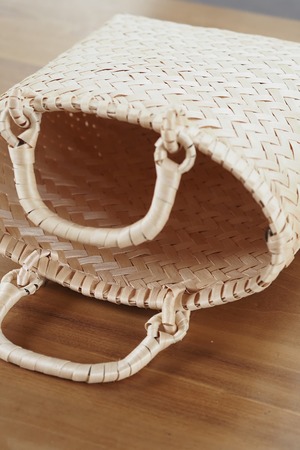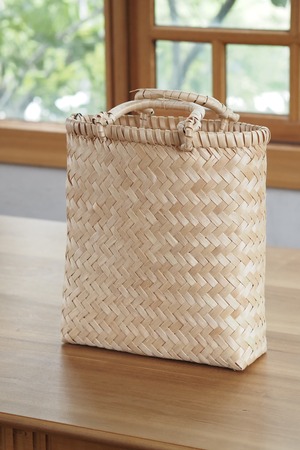 白木が美しいイタヤかごは横型と縦型の2種届いています。こちらはその縦型になります。A4のものが立ててすぽっと納まる深さです。こちらもひとつ前の横型と同様に、持ち手の部分は強度を出すためチューブ状のものにイタヤを巻き付けてあります。軽くて美しくて丈夫なイタヤ細工、ここ九州ではなかなか目にすることがない貴重なかごバッグです。