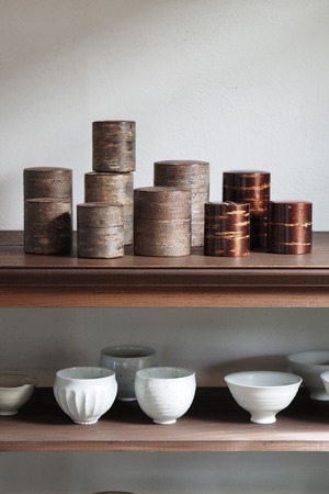 制作はすべて手作業であり、茶筒は沢ぐるみの経木(きょうぎ)に桜皮を貼り付けています。接着には膠(にかわ)を使用し、直火で熱したコテで貼り付けていきます。コテが高温すぎると皮は焦げてしまうので、温度調整します。水が入ったボウルに熱したコテを潜らせ、蒸発する音を聞き分けて調整します。