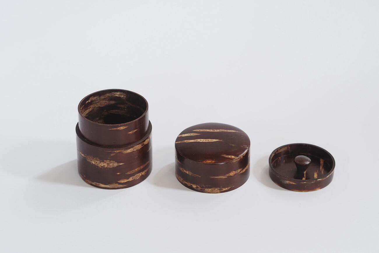 制作はすべて手作業であり、茶筒は沢ぐるみの経木(きょうぎ)に桜皮を貼り付けています。接着には膠(にかわ)を使用し、直火で熱したコテで貼り付けていきます。コテが高温すぎると皮は焦げてしまうので、温度調整します。水が入ったボウルに熱したコテを潜らせ、蒸発する音を聞き分けて調整します。