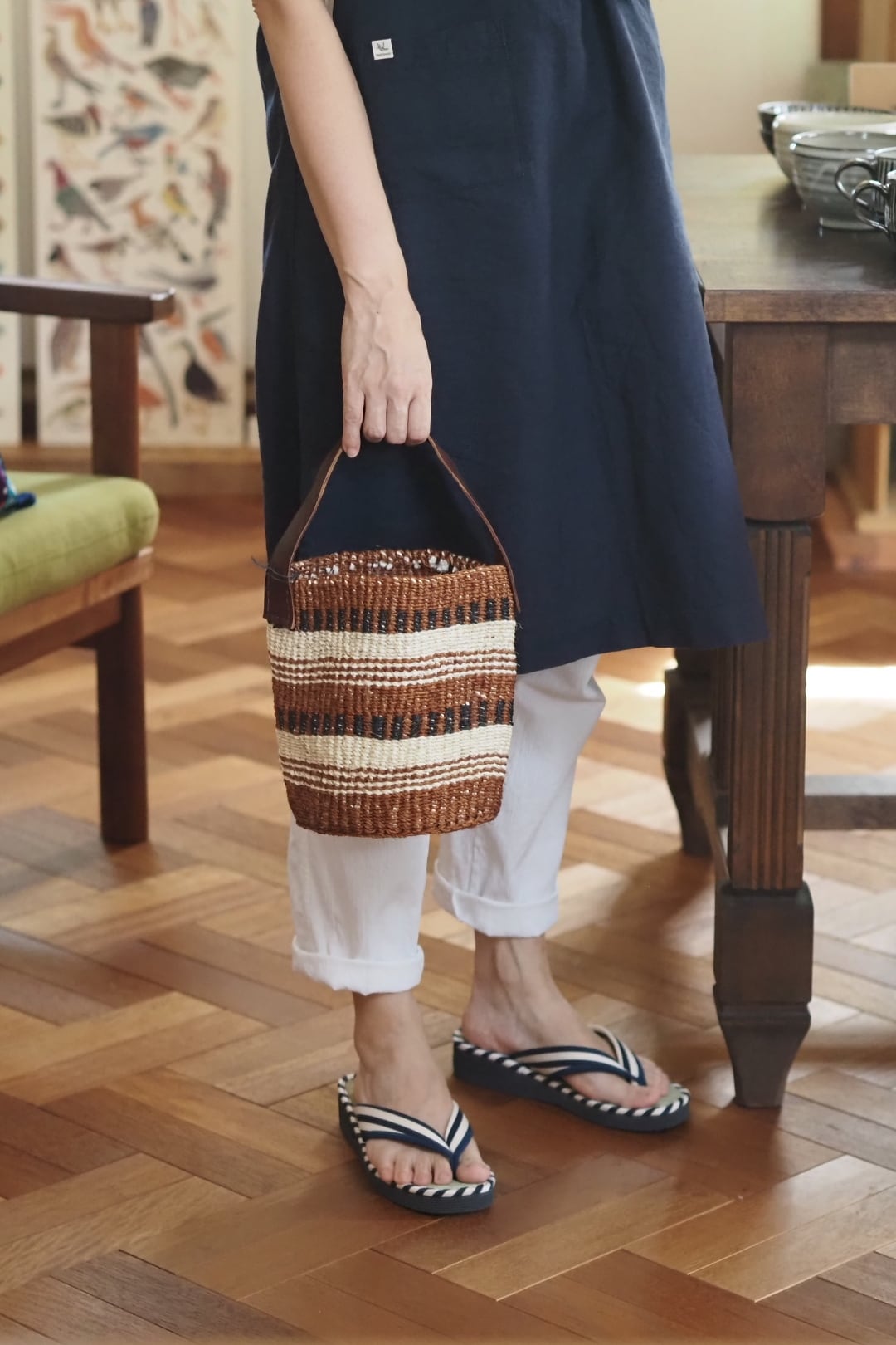 内布・内ポケットのないシンプルなかごバッグです。使いはじめは少しサイザル特有のチクチク感がありますが、使っていくと馴染んできます。使わない時にはぺたんこに畳んでしまっておけるのでかさばりません。