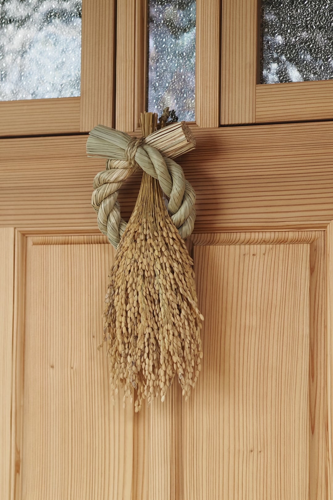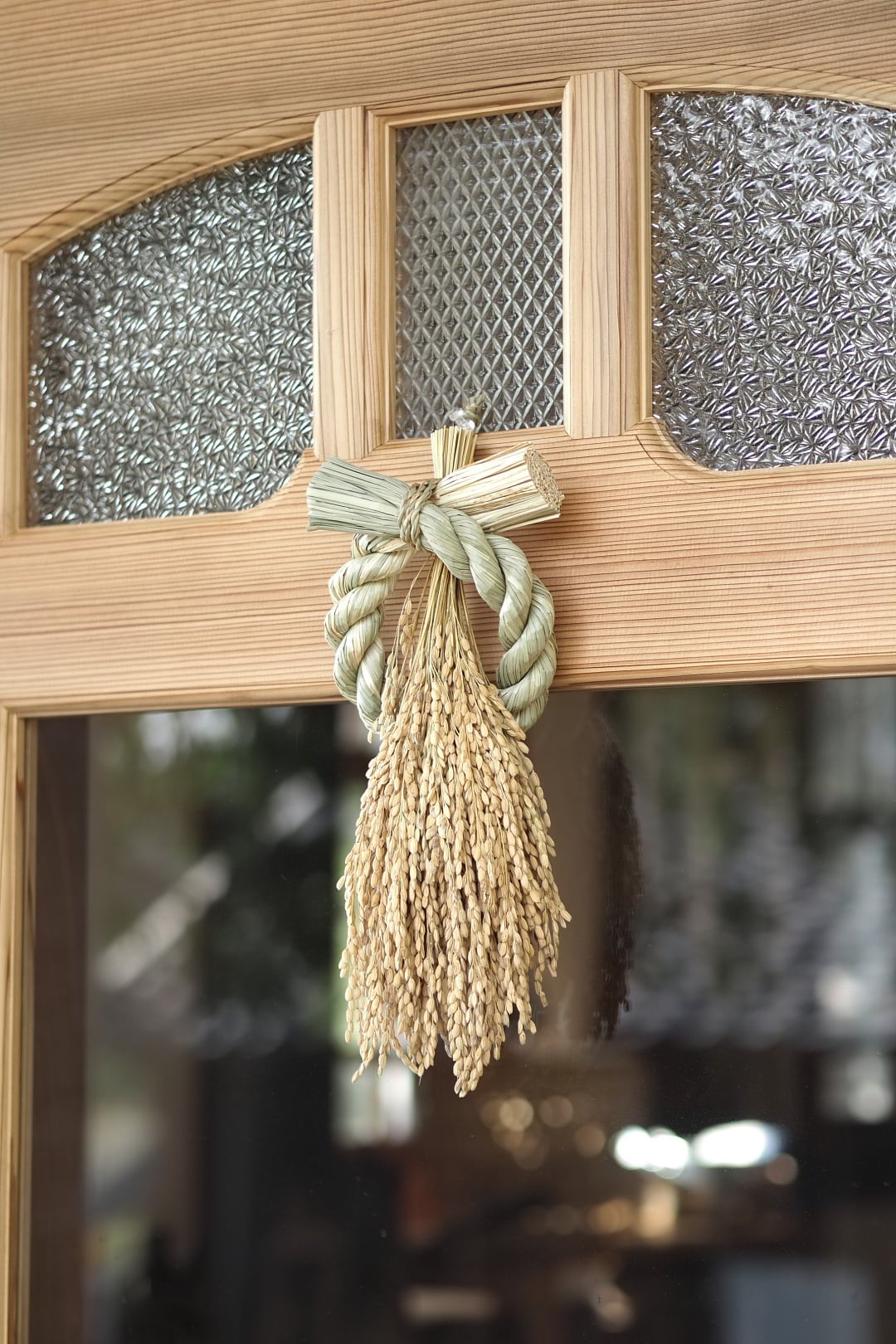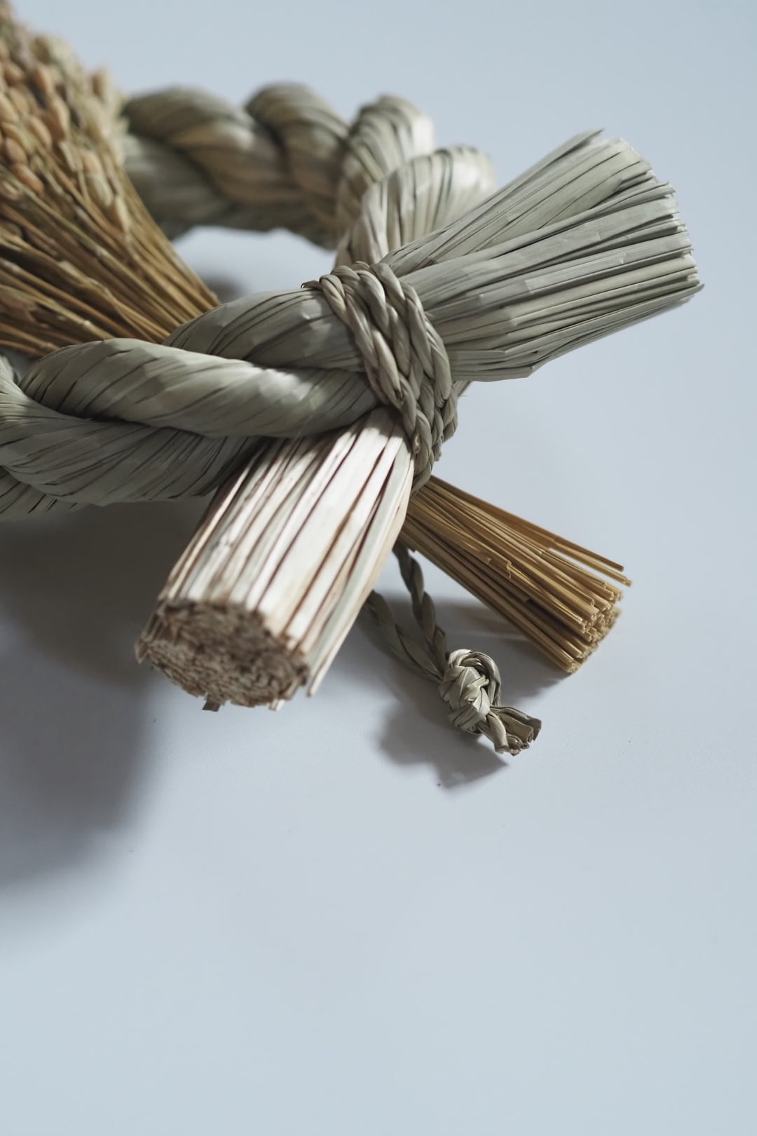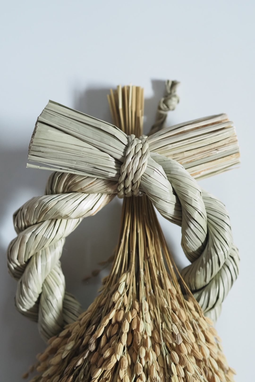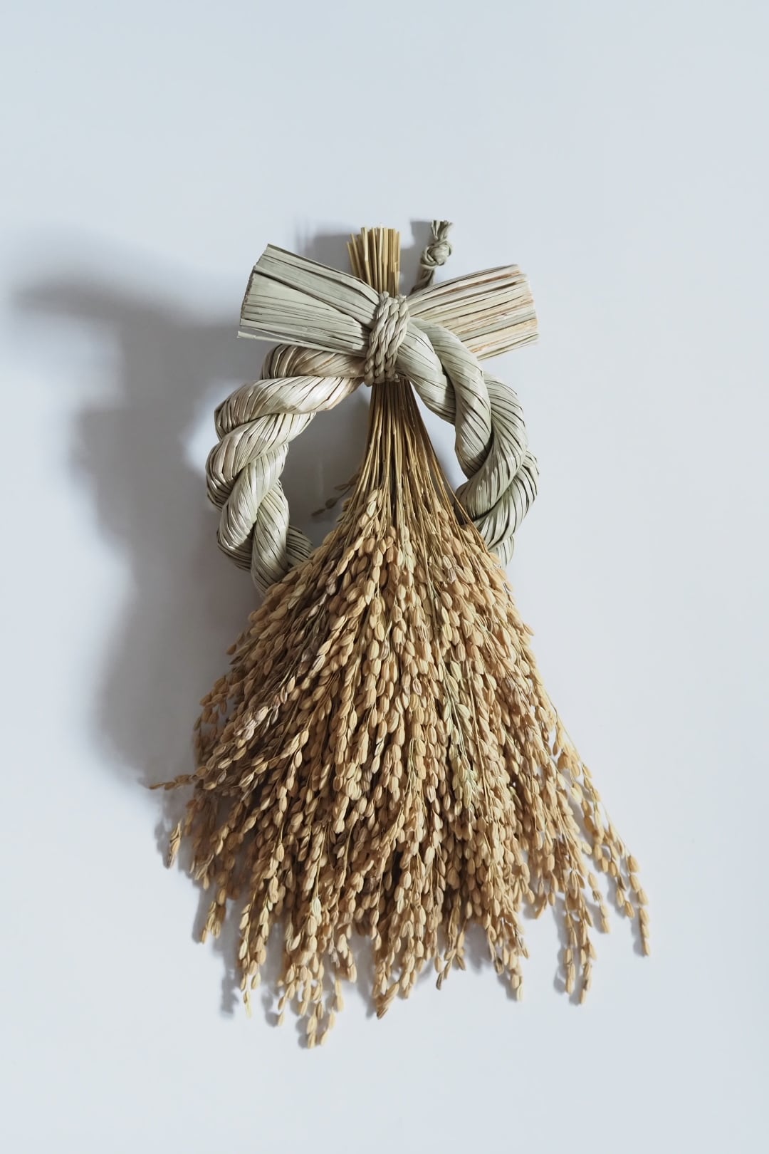 ▶「しちとうい」とは、大分県の国東半島のみで栽培されている植物で、本来は畳表の原材料として使われています。通常しめ飾りに用いられる稲わらと比べると、艶と光沢があって上品な佇まいです。ずっしりと綯った輪に、たわわに束ねた稲穂が添えられてシンプルながらもその重みと稲穂の揺らぎに豊かさが感じられます