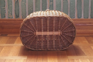 ラトビアのバスケットはがっちりと丁寧に編まれた硬めの仕上がりです。柳編みバスケットの色の違いは、表皮を剥いてる剥いていない、品種の違い、収穫時期の違い、収穫してからどれくらい寝かしたか、などによります。なかには石や鉄で染めているものもあり、少しずつ濃い色に変化していきます。このバスケットは、上下の縁の部分は染めていて、ほかの部分は表皮を剥いていない自然の色です。