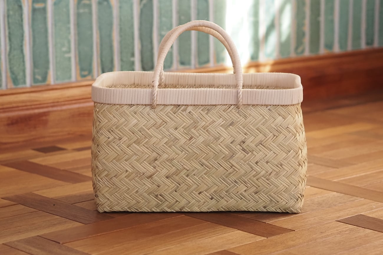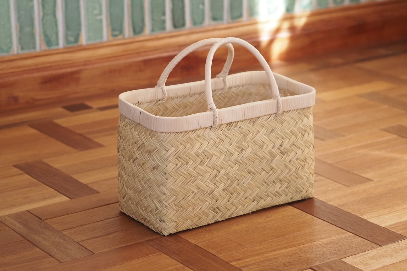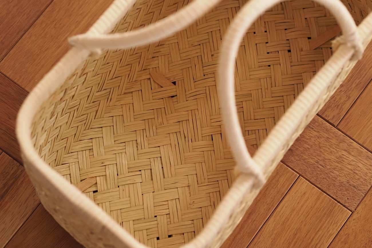 昔から「市場かご」と呼ばれて親しまれているすず竹のかごバッグです。出来立ては青々とした色をしていますが、徐々に青みは抜けていきベージュへ変化していきます。こちらを撮影した時期は2026年2月初旬ですが、すでに側面は色が抜け始めています。底面は光が当たっていないので、まだ青みが残っている状態です。このような経年の変化もご承知いただいた上でご購入ください。