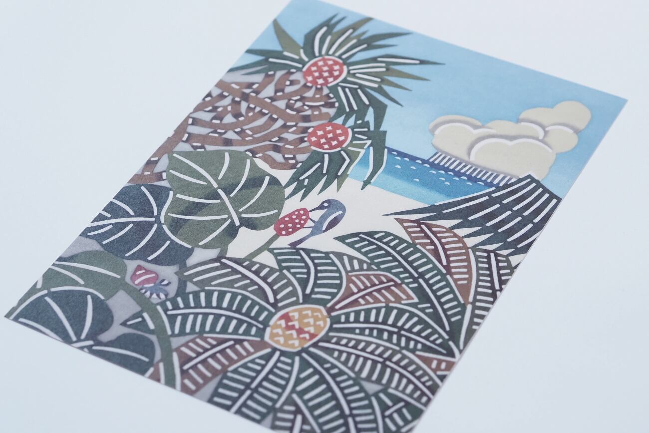 「紅型工房べにきち」を主宰する吉田誠子(よしだのぶこ)さんの作品より、人気のデザイン「海へ」がミニポスターになりました!こだわりのスキャンと印刷で、手染めの色と味わいが忠実に再現されたほぼ原画実物大のポスター(印刷物)です。